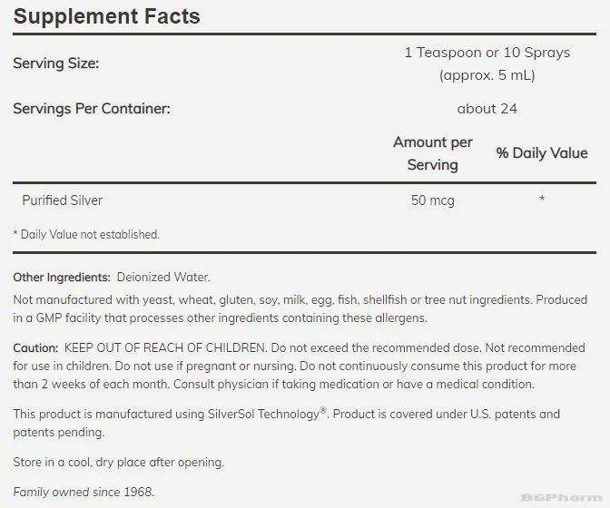 Произведено по патентована технология, различаваща се от традиционните методи за производство на колоидно сребро. Продуктът съдържа пречистено сребро с концентрация 10 частици на милион (ppm) и дестилирана вода, без мирис и вкус, което го прави лесен за употреба. Колоидното сребро е известно със своите антивирусни и антибактериални свойства и се използва като дезинфектант при външни инфекции. Пероралната му употреба може да подпомогне имунната система. Препоръчителната доза за възрастни е 6 впръсквания 2-3 пъти дневно, а за деца над 4 години – 1 впръскване 1-3 пъти дневно. Преди употреба се консултирайте с лекар