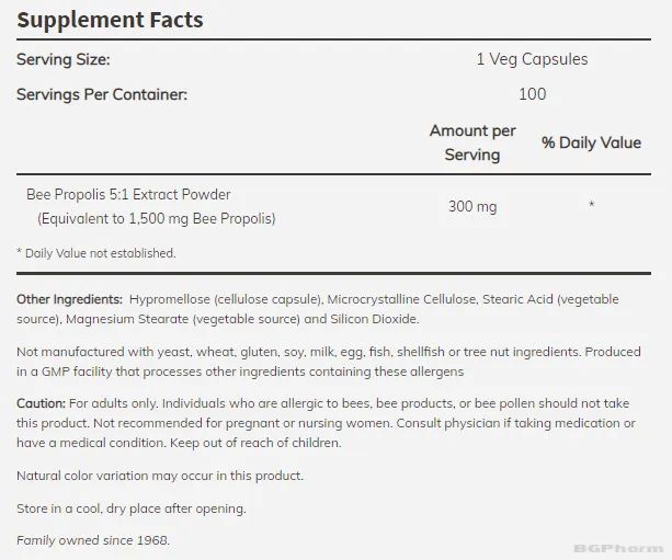 Естествен пчелен продукт, богат на биофлавоноиди и други биоактивни съединения, известен със своите антибактериални, противовирусни и противогъбични свойства. Той подпомага имунната система, насърчава оздравителните процеси и има антиоксидантно действие. Препоръчителната доза е една капсула 1-3 пъти дневно, за предпочитане с храна.