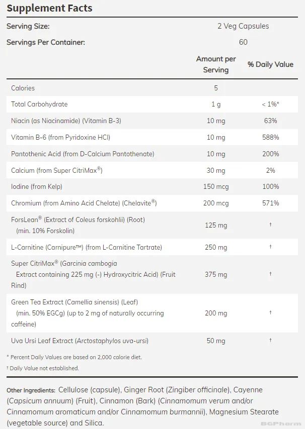 Хранителна добавка, предназначена да подпомага метаболизма на мазнините и управлението на теглото. Формулата включва ForsLean® (екстракт от корен на Coleus forskohlii – Колеус Форсколии), Super CitriMax® (екстракт от плод на Garcinia cambogia – Гарциния Камбоджа, съдържащ хидроксилимонена киселина), Carnipure® (L-карнитин), екстракт от зелен чай (Camellia sinensis, съдържащ минимум 50% епигалокатехин галат - EGCg), екстракт от листа на мечо грозде (Arctostaphylos uva-ursi ), както и витамини и минерали като ниацин, витамин B-6, пантотенова киселина, калций, йод и хром. Тази комбинация от съставки е предназначена да подпомага здравословното използване на мазнините, особено когато се съчетава с балансирана диета и програма за упражнения. Препоръчителният прием е 1–2 капсули два пъти дневно.
