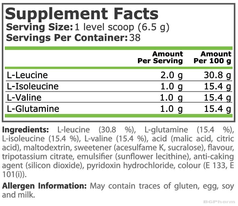 5000 mg верижно разклонени аминокиселини (BCAA) в съотношение 2:1:1, съдържащи L-левцин, L-изолевцин и L-валин, които насърчават мускулния растеж и възстановяването. Формулата включва също 1000 mg L-глутамин за имунната система и подобряване на възстановяването, както и витамин B6 за подпомагане на енергийния метаболизъм. Добавката не съдържа захари и се предлага в разнообразие от плодови вкусове. Препоръчителната доза е една мерителна лъжичка (6,5 г), разтворена в 250-400 мл вода, приемана преди или след тренировка, сутрин или между храненията.