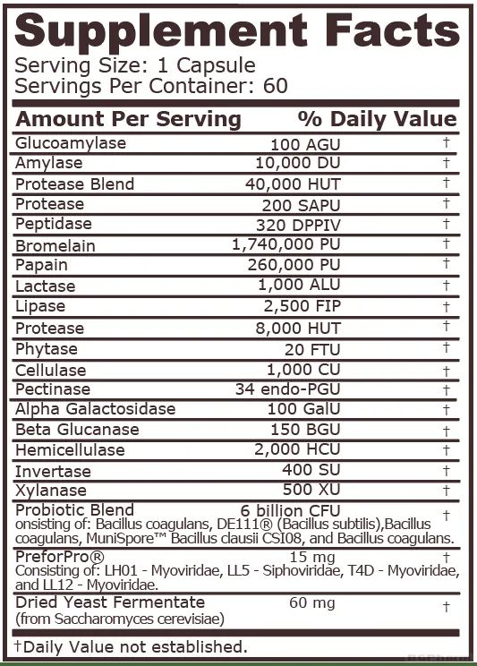 Създадена да подпомогне и подобри здравето на храносмилателната система. Формулата комбинира мощен комплекс от храносмилателни ензими, пробиотици и патентована смес от пребиотици PreforPro®, които работят синергично за оптимизиране на храносмилането и балансиране на чревната флора. Препоръчителният прием е 4 капсули дневно, разделени на два приема по 2 капсули – с обяд и вечеря.