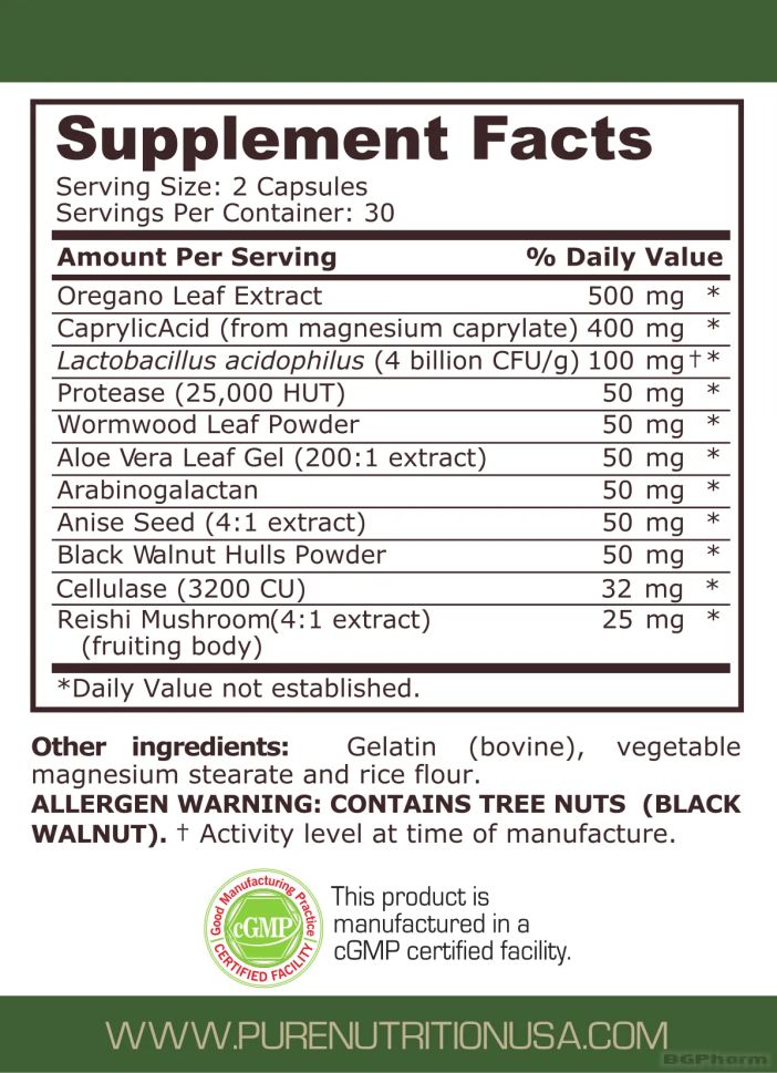 Създадена за подпомагане на храносмилателната система и борба с гъбични инфекции, причинени от Candida albicans. Формулата комбинира съставки като екстракт от риган, каприлова киселина, черен орех, пробиотици, алое вера и гъби рейши, които действат синергично за подобряване на чревната флора, намаляване на стомашния дискомфорт и детоксикация на организма. Препоръчителният прием е две капсули дневно по време на хранене. Този продукт е подходящ за хора, които търсят естествен начин за поддържане на здравословен баланс на чревната микрофлора и укрепване на имунната система.