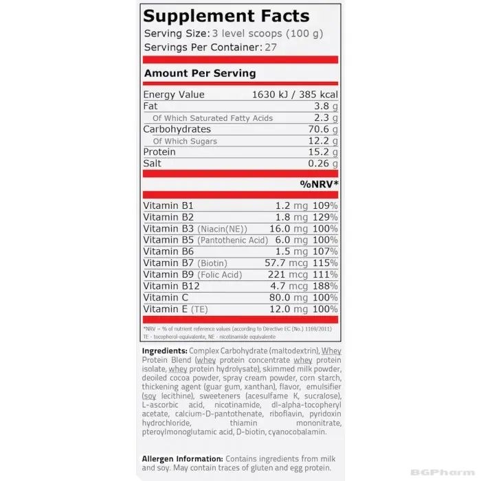Създаден да подпомогне покачването на чиста мускулна маса. Всяка доза осигурява балансирана комбинация от бързи и сложни въглехидрати, които предоставят устойчиви енергийни нива и бързо възстановяване на гликогеновите запаси след тренировка. Продуктът е обогатен с висококачествен суроватъчен протеин, доставящ необходимите аминокиселини за мускулен растеж и поддържане на положителен азотен баланс. Добавените витамини от група B и витамин C подпомагат общото здраве и енергийния метаболизъм. Lean Mass съдържа и диетични фибри, които улесняват храносмилането на въглехидратите, протеините и мазнините в продукта. Препоръчителният прием е една доза след тренировка или между храненията, смесена с вода или мляко.