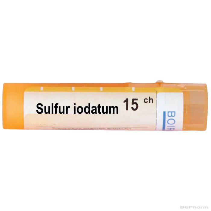 ПОКАЗАНИЯ: Sulfur iodatum e висококачествен хомеопатичен препарат, който има благоприятно въздействие при ринофарингити, ангини и алергични ринити със затруднено дишане. Приемът му облекчава възпаленията на дихателните лигавици. Сулфур йодатум се прилага също и при папулозно акне, при възстановяване от инфекциозни болести, както и при артрозни кризи при болести от възпалителен произход.