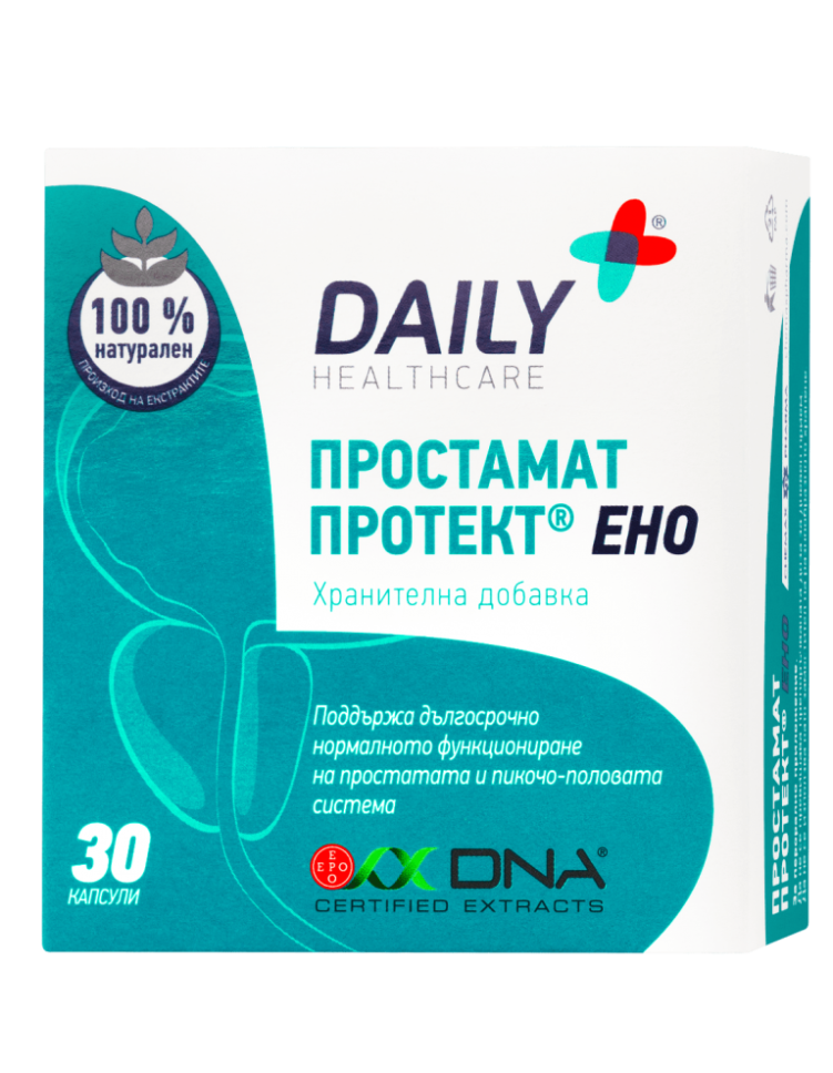 ПОКАЗАНИЯ: Daily Prostamat Protect Eno е хранителна добавка в капсули със забавено освобождаване, съдържаща натурални екстракти и цинк за нормалното функциониране на простатата и покочо-половата състема при мъжете. Простамат протект Ено допринася за нормалната сперматогенеза и доброто сексуално здраве на мъжете. Притежава силни антиоксидантни свойства и повлиява благоприятно имунитета.