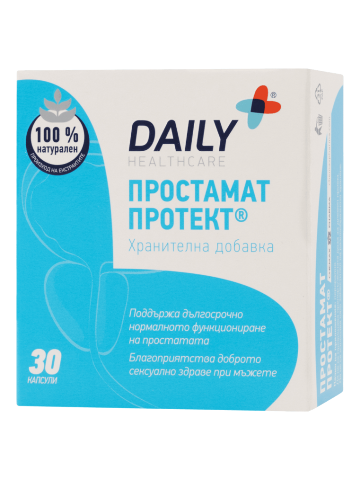 Хранителна добавка, предназначена за поддържане на нормалното функциониране на простатата и пикочо-половата система при мъжете. Всяка капсула съдържа 160 mg стандартизиран течен екстракт от плодовете на Сао Палмето (Serenoa repens), извлечен чрез съвременен метод с въглероден диоксид, осигуряващ висока концентрация и чистота на активните съставки без остатъци от разтворители и тежки метали. Продуктът допринася за намаляване на налягането върху пикочния мехур, подобрява струята на урината и подпомага доброто сексуално здраве. Препоръчителният прием е по 1 капсула два пъти дневно след хранене. Простамат Протект е подходящ за дългосрочна употреба и се отличава с добра поносимост, като специалната твърда желатинова капсула минимизира възможните стомашни неразположения, свързани с приема на течни екстракти