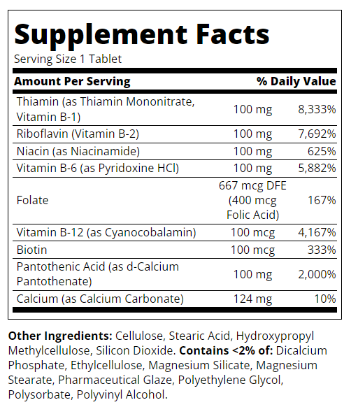 Хранителна добавка, предназначена да подпомага енергийния метаболизъм и здравето на нервната система чрез бавно освобождаване на витамини от група B. Всяка таблетка съдържа високи дози от основни витамини: тиамин (B1) – 100 mg, рибофлавин (B2) – 100 mg, ниацин (B3) – 100 mg, витамин B6 – 100 mg, фолиева киселина – 667 mcg DFE (400 mcg фолиева киселина), витамин B12 – 100 mcg, биотин – 100 mcg и пантотенова киселина (B5) – 100 mg, както и 124 mg калций. Тези витамини играят ключова роля в преобразуването на храната в енергия и поддържането на здравето на нервната система и тъканите. Формулата е без глутен, ГМО, добавени захари, мая, консерванти и изкуствени аромати, което я прави подходяща за широк кръг потребители. Препоръчителната доза е една таблетка дневно с храна.