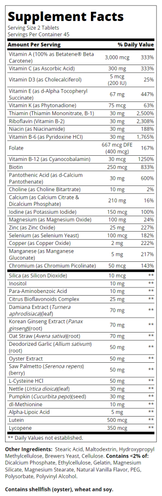 Високопотентна мултивитаминна и мултиминерална добавка, специално формулирана да отговори на нуждите на мъжкия организъм. Всяка дневна доза от две таблетки съдържа 35 основни витамини, минерали и растителни екстракти, включително витамини A, C, D3, E, K, пълен спектър от витамини B-комплекс, както и минерали като цинк, селен, магнезий и хром. Допълнително, формулата е обогатена с растителни съставки като екстракти от дамяна, корейски женшен, трионеста палма, коприва и тиквени семки, които подпомагат здравето на простатата, сърдечно-съдовата система и имунната функция. Продуктът е без глутен, без добавени сол или консерванти, но съдържа съставки от миди (стриди), пшеница и соя. Препоръчителната доза за възрастни е две таблетки дневно с храна или според указанията на здравен специалист. Тази добавка е особено подходяща за мъже, които търсят цялостна подкрепа за здравето си, включително енергия, имунитет и репродуктивна функция.