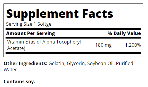 Хранителна добавка, предназначена да осигури мощна антиоксидантна подкрепа и да подпомогне здравето на клетките и имунната система. Всяка капсула съдържа 180 mg витамин E под формата на dl-алфа токоферил ацетат, което представлява 1200% от препоръчителната дневна доза. Препоръчителната доза за възрастни е една капсула с храна два пъти дневно или според указанията на здравен специалист. Редовният прием на този витамин може да подпомогне здравето на сърдечно-съдовата система, мускулната тъкан, косата, кожата и ноктите и да осигури защита срещу оксидативен стрес.