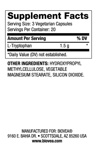 Есенциална аминокиселина, която организмът не може да синтезира самостоятелно и трябва да се набавя чрез храната или добавки. Той е предшественик на серотонина – невротрансмитер, отговорен за регулирането на настроението, съня и апетита. Приемът на L-триптофан може да подпомогне релаксацията, да подобри качеството на съня и да насърчи позитивното настроение. Препоръчителната доза е 1 капсула дневно, за предпочитане преди лягане, с достатъчно количество вода. Продуктът е подходящ за вегетарианци и не съдържа изкуствени добавки.