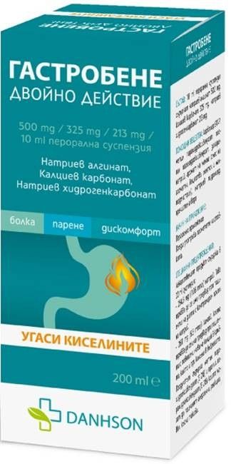 ПОКАЗАНИЯ: Gastrobene Double Action, перорална суспензия се прилага за облекчаване и лечение на киселини, нарушено храносмилане, връщане на стомашното съдържимо в хранопровода след нахранване, вкл. и при т.н. рефлукс езофагит. Лекарството може да се прилага при такива оплаквания и при бременни жени.