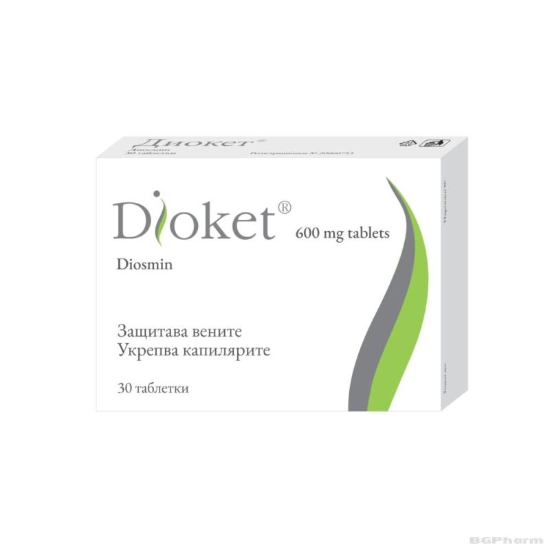 Dioket е лекарствен продукт, използван за лечение на венозно-съдови нарушения като хронична венозна недостатъчност, разширени вени и хемороидални кризи. Съдържа активната съставка диосмин, която подобрява венозния тонус, намалява венозната стаза и укрепва стените на капилярите, като по този начин намалява тяхната пропускливост и риска от възпаления. Обичайно се приема по 1 таблетка дневно (600 мг), за предпочитане сутрин, а при остри хемороидални кризи дозата може да бъде повишена според предписанието на лекар. Dioket е ефективно средство за облекчаване на симптомите на венозна недостатъчност и за поддържане на здравето на венозната система.