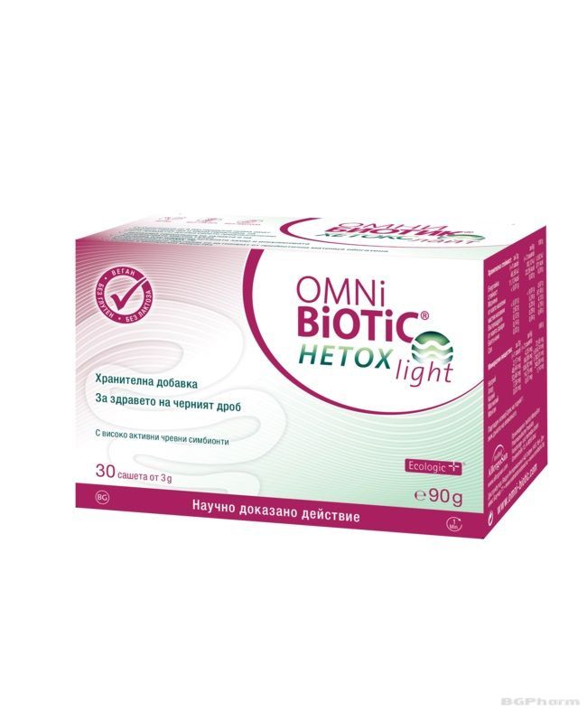 Синбиотик, съдържащ 9 специално подбрани бактериални щама, като Lactobacillus casei W56 и Bifidobacterium bifidum W23, с общо 7,5 милиарда живи бактерии на саше. Продуктът е предназначен за подпомагане на чернодробната функция и метаболизма, като спомага за намаляване на обиколката на талията и висцералната мастна тъкан, както и за подобряване на нивата на кръвната захар и инсулиновата резистентност. Препоръчителната доза е 1-2 пъти дневно по едно саше, разтворено в около 125 мл вода; изчакайте минимум една минута за активиране, разбъркайте отново и изпийте на празен стомах, за предпочитане преди закуска и/или вечеря. Омни-Биотик Хетокс Лайт не съдържа животински протеини, глутен, мая и лактоза, което го прави подходящ за хора с алергия към мляко и лактозна непоносимост.