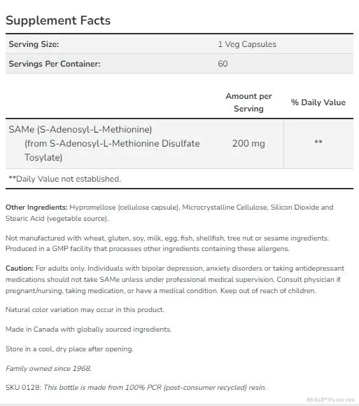 Съдържа 200 mg S-аденозил-L-метионин във всяка веган капсула. SAMe е съединение, естествено присъстващо в организма, което участва в множество биохимични процеси, включително синтеза на невротрансмитери, поддържането на здравето на черния дроб и регенерацията на съединителната тъкан. Приемът на SAMe може да подпомогне емоционалното благополучие, здравето на ставите и чернодробната функция. Препоръчителният прием е по 1 капсула 2 до 4 пъти дневно на празен стомах.