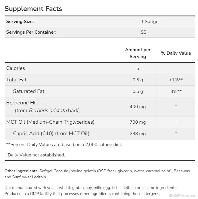 Берберин HCl (от Berberis aristata) - 400 mg: Активно съединение, което подпомага метаболизма на глюкозата и мазнините и има антиоксидантни и противовъзпалителни свойства.